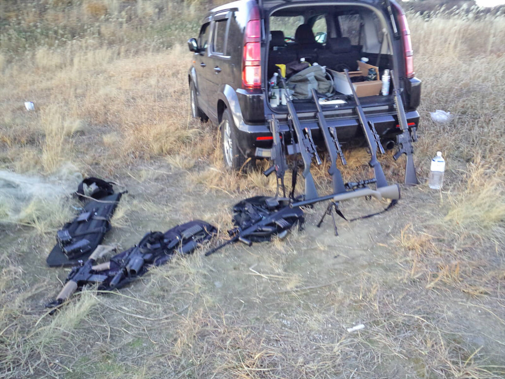 車に立てかけてある内の右端が俺のナイツもどきです\(^q^)/ちなみにここにあるガンの内俺のとG36C以外は全部友人H(仮名)のものです(